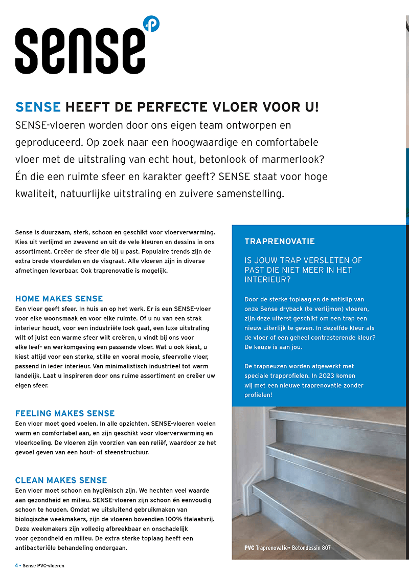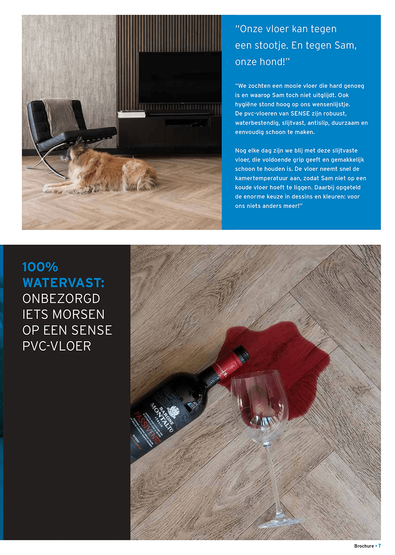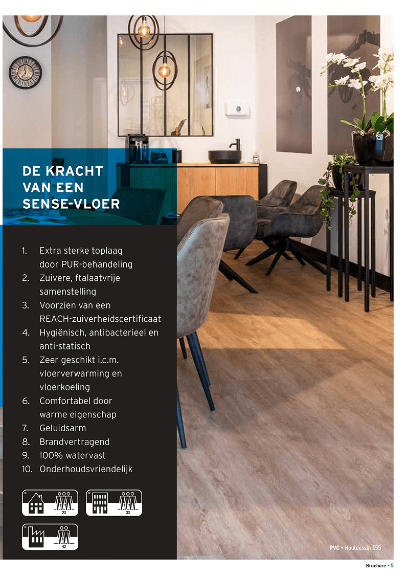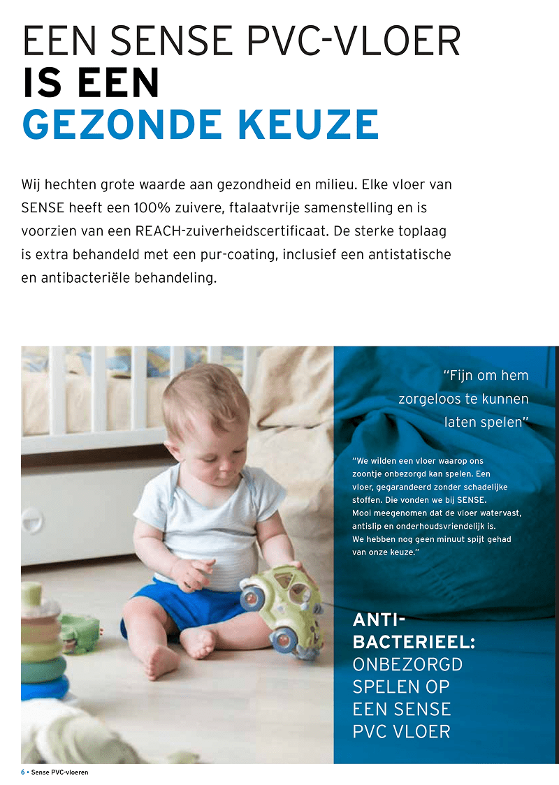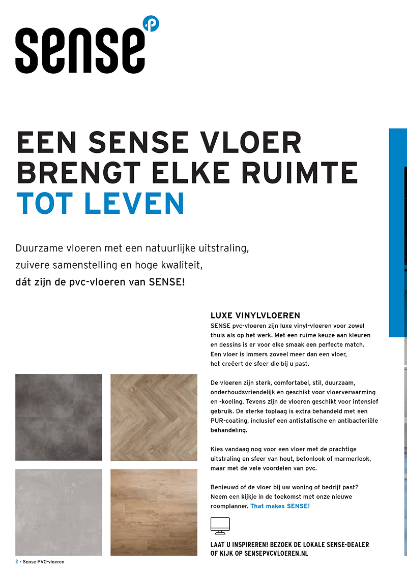 Ben je op naar jouw laatste vloer, maar heb je nog wat inspiratie nodig? Bij Sense hebben we een groot assortiment aan stijlen, zoals houtlook, betonlook of marmerlook. Al deze verschillende stijlen hebben een aantal dingen wél gemeen. Al onze producten zijn van de hoogste kwaliteit en blijven gegarandeerd voor lange tijd mooi. Nu nog een mooie kleur uitkiezen. Daar helpen we ook graag bij. Bekijk onze brochure en ontdek welke duurzame vloer het beste bij jou past.